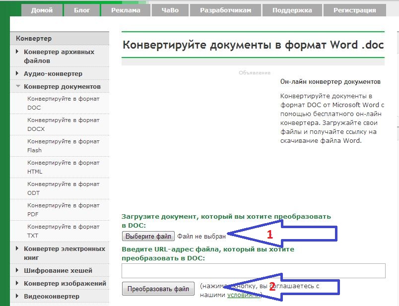 Выбираем формат конечного документа DOC в разделе "КОНВЕРТЕР ДОКУМЕНТОВ" и попадаем на страницу: