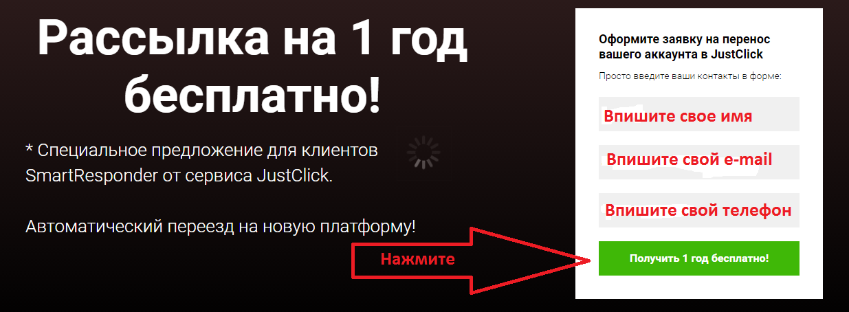 JUSTCLICK предлагает бесплатное использование сервиса для пользователей SmartPesponder на 1 год. Причем аккаунт должен быть новый! Если вы ранее были зарегистрированы на JUSTCLICK, то вам просто помогут перенести базу. Что же делать? Создавать НОВЫЙ аккаунт, аккаунт с другой почты. Для этого перейдите по ссылке на JUSTCLICK.