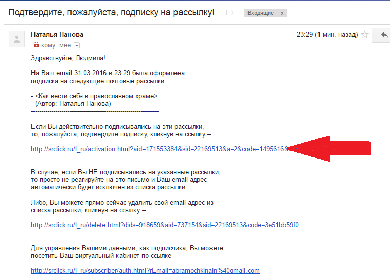 Теперь проверьте почту. Должно прийти письмо под названием "Подтвердите, пожалуйста, подписку на рассылку", образец смотрите ниже:
